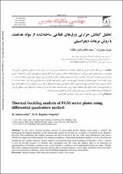 چکیده- در این مقاله کمانش حرارتی یک قطاع ساخته شده از مواد هدفمند بررسی شده است. فرض شده است خواص مکانیکی و حرارتی ماده هدفمند در راستای ضخامت تغییر می کند. معادلات تعادل و پایداری به کمک فرضیات غیر خطی فون کارمن و با استفاده از تئوری مرتبه اول برشی بدست آمده است. برای گسسته سازی معادلات تعادل و پایداری از روش مربعات دیفرانسیلی استفاده شده است. در روش استفاده شده، از توزیع نقطه ای غیر یکنواخت (توزیع چبیشف-گوس- لوباتو) جهت افزایش سرعت همگرایی و دقت حل استفاده شده است. با استفاده از روش مربعات دیفرانسیل هیچ محدودیتی در اعمال شرایط مرزی وجود ندارد و انواع شرایط مرزی را می توان در هر لبه قطاع اعمال نمود. در انتها نتایج بدست آمده با نتایج دیگر تحقیقات، جهت بررسی دقت محاسبات مقایسه گردیده و اثر ضخامت، زاویه قطاع، نسبت شعاعی، اثر توان ماده هدفمند و شرایط مختلف مرزی بر روی دمای بحرانی کمانش به تفصیل بررسی شده است.