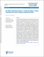 The present study investigated the effect of practicing domestic vs. foreign newspaper on Iranian Intermediate EFL Learners’ reading comprehension ability. The main question this study tried to answer was whether or not practicing domestic vs. foreign newspaper has any effect on Iranian Intermediate EFL Learners’ reading comprehension ability. To answer this question, 45 Iranian learners were selected via administering an OPT test with the criteria of at least 1 standard deviation below and above the mean of the Oral Proficiency Test (OPT). Reading section of Reading Practice Test was used as the OPT. It consists of 19 items. It takes approximately 25 minutes to complete the reading test. Learners were studying in three intermediate classes in Simin Institute of Ramsar, Iran. The participants were all female and ranged in age from 17 to 19. They were divided into three groups of 15 (N=15)ː two experimental groups and a control group. A pretest of reading comprehension was administered to the three groups. The first experimental group was treated by teaching reading comprehension plus domestic newspaper; the second experimental group was treated by teaching reading comprehension plus foreign newspaper and the control group was treated by a placebo. Finally; after 10 sessions, a posttest of reading comprehension was administered to three groups. One-Way ANOVA and Paired Sample were used to analyze the obtained data. The results of One-Way ANOVA and Paired Sample indicated that the participants’ practicing domestic vs. foreign newspaper had effect on Iranian Intermediate EFL Learners’ reading comprehension ability.