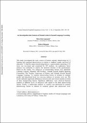 این تحقیق به بررسی منابع اصلی کاهنده انگیزه دانش آموزان ایرانی در یادگیری زبان دوم و سنجش رابطهبین کاهش انگیزه و جنسیت و مقطع تحصیلی دانش آموزان می پردازد. به منظور یافتن عوامل اصلیکاهنده انگیزه پرسشنامه ای با 32 سوال پنج گزینه ای تدوین و توسط 327 دانش آموز دختر و پسر تکمیلشد. به منظور بررسی عوامل اساسی پرسشنامه تحلیل عامل اکتشافی انجام شد. بر اساس نتایج پنج دسته ازعوامل کاهنده انگیزه شناسایی شدند: مطالب مواد و امکانات اموزشی، نگرش نسبت به جامعه انگلیسی زبان،معلم، تجربه شکست، نگرش نسبت به یادگیری زبان دوم. به منظور بررسی عوامل کاهنده انگیزه در رابطهبا جنسیت و مقطع آموزشی دانش آموزان دو تحلیل واریانس یک طرفه انجام شدند. یافته ها تفاوتمعناداری بین دانش آموزان دختر و پسر در مورد سه عامل کاهنده انگیزه نشان دادند. تفاوت معناداری بیندانش آموزان در مقاطع تحصیلی مختلف نسبت به سه عامل کاهنده انگیزه مشاهده شد. در پایان، یکتحلیل واریانس چند متغیره به منظور بررسی تفاوتهای بین دانش آموزان دختر و پسر در مقاطع تحصیلییکسان در مورد عوامل کاهنده انگیزه انجام شد. تفاوت معناداری بین دانش آموزان دختر و پسر در مقاطعتحصیلی مختلف نسبت به همه عوامل کاهنده انگیزه جز یک مورد یافته شد.