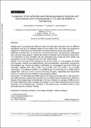 نتیجه گیری: روش Demirjian همواره با بیشبرآوردی و روش Nolla با کمبرآوردی از سن تقویمی همراهاند. با توجه به تفاضل سن تقویمی و سن دندانی در دو روش، بهطور کل میانگین تفاضل ها، در روش Nolla نسبت به روش Demirjian کمتر بوده، و روش Nolla برآورد صحیح تری از سن تقویمی داشته است. لذا از مطالعه حاضر رجحان روش Nolla بر روش Demirjian نتیجه می شود.