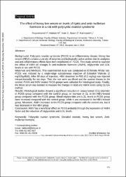 سابقه و هدف: سندروم تخمدان پلیکیستیک ( PCOS ) بیماری التهابی است. زهر زنبور عسل ( HBV ) حاوی طیفی از آنزیمها و آمینهای فعال بیولوژیکی است که اثرات ضد درد و ضدالتهابی آن بر این سندروم به اثبات رسیده است. هدف از این تحقیق بررسی اثر HBV بر تغییرات هورمون آنتی مولارین ( AMH ) ، تری گلیسیریدو LDL در موشهای صحرائی مبتلا به PCOS است. مواد و روشها: این مطالعه تجربی بر روی 63 سر موش صحرائی ویستار ماده صورت گرفت. جهت القاء PCOS ، استرادیول والراتبهصورت تک مرحلهای زیرجلدی ( gr 100 mg / 2 وزن بدن ) تزریق شد. پس از60 روز، 2 /0 میلیگرم HBV حل شده در PBS به ازای هرکیلوگرم وزن بدن بهصورت درون صفاقی بهمدت 10 روز تزریق گردید . سپس، موشها کشته شدند و بافت تخمدانی گروههای کنترل، PCOS و PCOS تیمارشده با HBV برای مقایسه هیستولوژیک جمعآوری شد. سرم خون برای سنجش تغییرات سطوح لیپیدها و آنتیمولارین هورمون با روش الایزا جدا گردید. نتایج: یافتههای مطالعه کاهش قابل توجهی را درجسم زرد درگروه PCOS نسبت به گروه کنترل وافزایش جسم زرد درگروه تحت درمان با HBV در مقایسه با گروه PCOS نشان داد. تری گلیسیرید و LDL در گروه PCOS نسبت به گروه کنترل افزایش یافته درحالیکه کاهش آن در گروه تیمار شده با HBV مشاهده شد. افزایش AMH در گروه PCOS نسبت به گروه کنترل مشاهده شد، ولی درنمونههای تیمارشده با HBV کاهش نشان داد. نتیجهگیری: در این بررسی میتوان عنوان نمودکه اثر مفید HBV بر روی PCOS ممکن است از طریق تأثیر بربیان فاکتور AMH و کاهش میزان تری گلیسیرید و LDL باشد.
