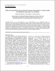 In this paper a numerical investigation is performed to study the effects of different nanofluids on convective heat transfer enhancement in a partitioned square cavity subject to different shapes of nanoparticle using water-SiO2 nanofluid. This study has been carried out to analyze the effects of SiO2 nanoparticle, its volumetric fraction between 2 and 4%, and nanoparticle shape (i.e. blades, platelets, cylindrical, bricks, and spherical), on the fluid flow and heat transfer characteristics. The overall continuity, momentum, and energy equations are solved by using the finite-volume method and the SIMPLE algorithm. The influence of related parameters such as Rayleigh number (Ra=105 to 107) and height of partition (h=0.1, 0.3, 0.5H) are studied. Based on the results, independent of nanoparticle shape, the streamlines and isotherms are extremely affected by Rayleigh number and height of partition. For a fixed amount of the partition height, average Nusselt number increases as the Rayleigh number rises.