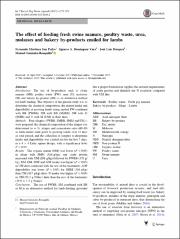 Introduction The use of by-products such as swine manure (SM), poultry waste (PW), urea (U), molasses (M) and bakery by-product (BB) is an alternative method for lamb feeding. The objective of the present study was to determine the chemical composition, dry matter intake and digestibility in growing lambs using ensiled PW combined with BB (PWBB), SM with BB (SMBB), SM with M (SMM) and U with M (UM) in their diets. Methods Four silages—PWBB, SMBB, SMM and UM— were prepared, the chemical composition of the silages was determined (n = 3), silages and concentrate ratio (60:40) as fresh matter were given to growing lambs over 21 days as total period, and the collection of samples to determine intake and digestibility was carried out for the last 7 days, in a 4 9 4 Latin square design, with a significance level P.05. Results The organic matter (OM) was lower (P.05) in silage with SMM (886 g/kg), and crude protein increased with UM (206 g/kg) followed by PWBB (170 g/ kg). DM, OM, NDF and ADF intake was higher (P.05) in UM diets compared with the rest of the treatments; ADF digestibility was lower (P.05) for SMM (389 g/kg) than UM (417 g/kg) diets. N intake was higher (P.05) in UM (51.3 g N/day) diets than the rest of the treatments (39.9 ± 1.3 g N/day). Conclusions The use of PWBB, SM combined with BB or M is an alternative method for lamb feeding, provided that a proper formulation supplies the nutrient requirements of crude protein and diminish the N excretion compared with UM diet.