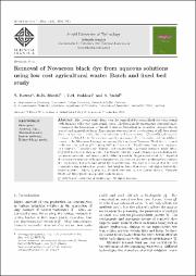 The present study deals with the removal of Novacron Black dye with peanutpeels biomass, a low cost agricultural waste. The batch mode experiments were performed to compare the biosorption potential of selected biosorbent in its native, glutaraldehydetreated and immobilized form. Experiments were conducted as a function of pH, biosorbent dose, contact time, initial dye concentration and temperature. Glutaraldehyde-treated biomass exhibited better biosorption capacity as compared to the native and immobilized peanut peels. Maximum biosorption capacity (37.1 mg/g) of Novacron Black dye by peanut peels was observed at pH 2 using 0.05 g biosorbent. Equilibrium data were analyzed by Langmuir, Freundlich and Temkin isotherm models. Langmuir isotherm model tted very well to the equilibrium data. The kinetic data was modeled using pseudo- rst-order, pseudo-second-order and intra-particle di usion models. Negative values of G depicted the spontaneous nature of biosorption process. Column studies were performed to optimize the bed height, flow rate and initial dye concentration. The results revealed that the best biosorption was achieved at greater bed heights, lower flow rates and higher initial dye concentrations. Bohrat-Adams model tted very well to the column data of Novacron Black dye biosorption onto peanut peels biomass.