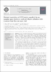 In this paper, free convection heat transfer in an annulus between confocal elliptic cylinders filled with CNT-water nanofluid is investigated numerically. The inner cylinder is at constant surface heat flux while the outer wall is isothermally cooled. Equations of continuity, momentum and energy are formulated using the dimensionless form in elliptic coordinates for two-dimensional, laminar and incompressible flow under steady state condition, which is expressed in terms of vorticity and stream function. The governing equations are discretized using the control volume method. For the thermo-physical properties of CNTs, empirical correlations are used in terms of the volume fraction of nanoparticles. For the effective thermal conductivity of CNTs, a new model has been used. The study is performed for modified Rayleigh number (103≤ Ram ≤106), volume fraction of nanoparticles (0≤ f ≤0.12). The eccentricity of the inner and outer ellipses and the angle of orientation are fixed at 0.9, 0.6 and 0°, respectively. Results are presented in the form of streamlines, isotherm contours, and distribution of temperature and local and average Nusselt numbers on solid boundaries. The results are also discussed in detail and a very good agreement exists between the present results and those from the literature.