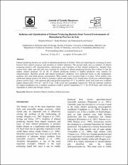 Ethanol producing bacteria are useful in industrial production of biofuel. There are interesting for screening of active bacteria from natural resources and introduce to biofuel industries. The present study aims to isolation of ethanol producing bacteria with characterization, optimization, and evaluation of their ethanol productivity. Samples from various fruits, plant saps and soils were screened for isolation of ethanol producing bacteria then evaluate to find the highest ethanol producer. Of all the 37 ethanol producing isolates, 6 highest producers were selected for characterization. Bacterial growth and ethanol production conditions were optimized based on pH, temperature, agitation, time and initial glucose concentration. Most isolates were occurred single or in pairs. All of isolates were motile and catalase positive but failed to hydrolyze gelatin and produce H2S. Among them, Zym6 was exhibited highest ethanol yield 6.28 gL-1 with optimum pH 6 and growth temperature 35 ˚C. In addition, Zym5 and Zym6 were exhibited highest ethanol yield 19.52 gL-1 and 18.75 gL-1 with xylose and tryptophan, respectively. Thus the optimum condition for ethanol production was a medium composed of pH 6, growth temperature 35 ˚C for 24-48 hours and xylose and tryptophan as carbon and nitrogen sources.