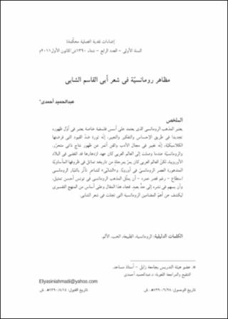 یعتبر المذهب الرومانسی الذی یعتمد علی أسس فلسفیة خاصة یعتبر فی أوّل ظهوره تجدیدا فی طریق الإحساس والتفکیر والتعبیر، إنّه ثورة ضدّ القیود التی فرضتها الکلاسیکیّة، إنّه تغییر فی مجال الأدب والفن أثمر عن ظهور نتاج ذاتی متحرّر. والرومانسیّة عندما وصلت إلی العالم العربی کان عهد ازدهارها قد انقضی فی البلاد الأوروبیة، لکنّ العالم العربی کان یمرّ بمرحلةٍ من تاریخه تماثل فی ظروفها المأساویّة المتدهورة العصر الرومانسیّ فی أوروبّا. و«الشابّی» - کشاعرٍ تأثّر بالتیّار الرومانسی استطاع - رغم قصر عمره - أن یمثِّل المذهب الرومانسی فی تونس أحسن تمثیل، وأن یسهم فی نشره إلی حدٍّ بعیدٍ. فجاء هذا المقال وعلی أساس من المنهج التفسیری لیکشف عن أهمّ المضامین الرومانسیة التی تجلت فی شعر الشابی.