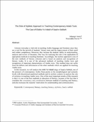 تلعب النصوص الأدبیة دوراً أساسیاً فی تعلیم اللغة والآداب العربیة، بما أنّها وسیلة لتنمیة التذوق الأدبی ودقة فهم المسموع والمکتوب عند المتعلَّم، کما تساعد الطلاب على حسن الفهم وتنمیة قدرتهم على التحلیل وتقییم النصوص. ومن أهم أسباب لتحقیق هذه الأهداف مناسبة طریقة التدریس المتبعة. فتعد الأسلوبیة من المناهج النقدیة الحدیثة التی تتناول النصّ الأدبی، معتمدة على التحلیل والتمیّز بین آثار الأدباء، وهی تمثل مرحلة متطورة من مراحل تطور فی تعلیم النصّ الأدبی المعاصر لاستخلاص أهم العناصر المکونة الأدبیة. وتستطیع الأسلوبیة أن تتجاوز حالة الضعف والقصور الموجودة فی تعلیم النصوص الأدبیة المعاصرة فی الجامعات الإیرانیة.