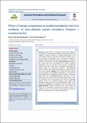 Purpose: Recently, there are researches showed positive effects of nano-chitosan in prolonging the postharvest quality and shelf life of strawberry, however, influences of storage temperatures on the nano-chitosan coated fruit have been overlooked. Therefore, in this work, changes of physiological traits of strawberry (Fragaria × ananassa Duch.) coated with 0.2% nano-chitosan and stored at different temperatures were studied. Research Method: Strawberry was coated with 0.2% nano-chitosan and stored at different temperatures (2°C, 5°C, 10°C and 25°C) for 12 days. The effects of temperatures on the coated fruits were tested by measuring visual quality, weight loss, antioxidant properties, malondialdehyde content, firmness, total soluble solid, polyphenol oxidase activity in three days intervals. Findings: After storing 0.2% nano-chitosan coated strawberry at four different temperatures, 2°C showed the most effective one as maintaining the overall quality of strawberry higher than the acceptable/marketable level after 12 days; meanwhile, fruits stored at 25°C were quickly decayed after 3 days. The treatments at low temperatures (2°C, and 5°C) significantly reduced weight loss, maintained firmness, total soluble solid, polyphenol oxidase activity and malondialdehyde content of the stored fruits. Limitations: Nano-chitosan has not been widely traded. Originality/Value: Coating strawberry with nano-chitosan and storing at 2°C effectively maintained the postharvest quality of strawberry as well. This treatment is quite simple and would be useful for stakeholders in the strawberry supply chain.