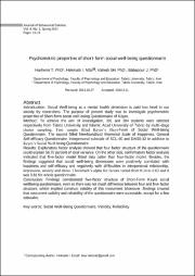 Introduction: The purpose of present study was to investigate social well-being Questionnaire psychometric properties among university students.Method: To achieve the aim of investigation, undergraduate students among Tabriz University (n=391; 131 male and 260 Female; age Mean= 21.32, SD= 3.12 and 22.42, SD= 2.86 respectively) and Islamic Azad University of Tabriz (n=384; 171 male and 212 Female; age Mean= 21.62, SD= 3.75 and 20.80, SD= 1.49 respectively) were selected by multi-stage cluster sampling and filled Keyes Social Well-being Questionnaire, Memorial University of Newfoundland Scale of Happiness, General Self-efficacy Questionnaire, SCL-90 interpersonal subscale and DASS-42.Results: Explanatory factor analysis showed four factor structure of this questionnaire which could explain 59.70 percent of total variance. Confirmatory factor analysis χ2/df, GFI, AGFI, CFI, AIC and RMSEA indices suggest that five-factor model fit data little more than four-factor model. Also the finding showed social well-being dimensions were positively correlated with happiness and self-efficacy and negatively with difficulties in interpersonal relationship, depression, anxiety and stress. Finally result showed factors Chronbach alpha vary between 0.41 and 0.63 and it was 0.81 for total questionnaire items.Conclusion: Findings corroborate five-factor model of social-well being suggested by Keyes, which imply construct validity of this instrument. Also finding suggest that the social well-being questionnaire has convergent validity and its reliability is good for total but not for factors.
