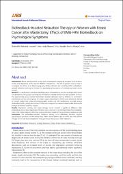 Abstract Introduction: Breast cancer patients usually react to mastectomy surgery by increased levels of stress, anxiety and depression which requires effective interventions. The aim of present research was to investigate the effects of an Electromyography (EMG) and heart rate variability (HRV) biofeedback-assisted relaxation training to alleviate the psychological symptoms of mastectomy breast cancer women. Method: In a randomized controlled trial design about 14 mastectomy women were randomly chosen and divided into two groups and measures of Depression Anxiety Stress Scale were gathered for them. The experimental group received biofeedback-assisted relaxation training, whereas no intervention administered on the control group. All subjects again completed the DASS scales afterwards. Indices of smooth artifact free surface Electromyography (sEMG) and HRV biofeedback recorded using a Biofeedback 2000 x-pert system Version 4. Data were analyzed by a General Linear Model: Multivariate Analysis of Variance statistical analysis. Results: Depression, anxiety, and stress average scores showed a significant difference after biofeedback intervention. Significant differences were observed in the sEMG and Heart Rate Variability-Index (HRV-Index) measures of the two groups with better results for the experimental subjects as well. Conclusion: The biofeedback-assisted relaxation training could effectively decrease negative psychological symptoms of the mastectomy breast cancer patients due to sEMG and HRV positive changes and is then recommended for these patients in the course of their treatment.