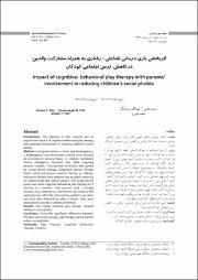 Introduction: The objective of this research was to explore the impact of cognitive-behavioral play therapy with parental involvement in reducing children’s social phobia.Method: Among elementary schools and kindergartens, 4 kindergartens and elementary schools were selected at convenience. Among these, 70 children completed Reiven Intelligence Quotient Test after acquiring parents’ consent. Then parents of children who gained IQ scores above average completed Spence Anxiety Scales (child and parent version). Finally, 30 children with social phobia were selected and assigned randomly to experimental and control groups. The experimental group was under cognitive behavioral play therapy for 8 sessions in 2 months. Their parents took 2 training sessions, too, whereas no intervention was taken in the control group. After the intervention, posttest was done and they were followed up after 1 month. Data were analyzed by covariance statistical method.Results: The results revealed play therapy reduced children’s social phobia.Conclusion: Given the significant difference between the case and control groups, play therapy can be used to reduce social phobia.