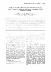 In this research a layer of Ni-Cu-P was deposited on 304 stainless steels by using gelatin and thiourea as additives in a sulfate solution. In order to determine the properties of deposited layers, a microhardness tester was used for microhardness measurement, X.R.D. for microstructural analysis, and a scanning electron microscope equipped with E.D.X. for determining morphology and analyzing the deposits. The results of the experiment show that in the presence of additives in solution, deposited layers are rough, and elements such as Fe,O2 and S enter into the layer, in the presence of thiourea and in the presence of gelatin Fe enters into the layer. The microhardness of alloyed layer without using additives is higher than the microhardness of the layer obtained in the solution containing gelatin and less than that containing thiourea. After heat treatment, the microhardness of layers increases, the reason is the formation of stable Ni3P phase in structure.