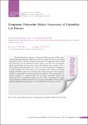 The anti-senescence biogenic polyamines (PAs) putrescine (Put), spermidine (Spd) and spermine (Spm) are involved in plant growth processes and responses to stress. The physiological mechanism of exogenous Put to affect the senescence of cut lisianthus flowers during vase life was investigated. Fresh cut lisianthus flowers were treated with distilled water (control), 0.5, 1 and 2 mM Put and then held at 25 ◦C up to 12 days. Exogenous Put supply at 2 mM extended vase life, which was associated with reduced electrolyte leakage and MDA content. Put treatment also reduced activity of lipoxygenase (LOX), is responsible for membrane lipid peroxidation. Put treatment also enhanced activities of catalase (CAT) and ascorbate peroxidase (APX) and decreased H2O2 accumulation during vase life. Thus, exogenous Put supplycould maintain membrane integrity by increasing antioxidant system activity, thereby retarding the senescence of cut lisianthus flower during vase life.