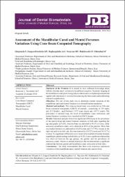 Statement of the Problem: It is crucial to have sufficient knowledge aboutinferior alveolar canal variations in mandibular surgeries. Anatomic imaging ofthe mandibular canal prior to surgical procedures such as implant placement andsagittal split osteotomy is essential for achieving the best results and confrontingminimal complications.Objectives: The aim of this study was to determine normal variations of themandibular canal and mental foramen in a selected Iranian population.Material and methods: This cross-sectional study was conducted on 334 conebeam computed tomography (CBCT) of patients , comprising of 119 malesand 215 females , aged between 15-75 years (mean age, 45±7.5 years). Theprevalence of anterior loop, the level of mandibular canal cortication, andmental foramen variations were recorded on CBCT images.Results: Statistical analysis showed no significant differences in the prevalenceof the anterior loop and mental foramen variations in both sides regarding the age and gender (p>0.05). Anterior loop was detected in 90.5% of cases, while accessory mandibular canals were observed in 4.6% of the patients. More thanone mental foramen was detected in 5 (4.2%) men and 17 (7.9%) women in theright side and in the left side; this was detected in 11(9.2%) men and 10 (4.7%)women. No significant differences were found in the number of mental foramenregarding to gender and age in both sides (p>0.05). A non-significant relationshipwas observed between the age groups, the gender, and the prevalence ofaccessory canals. Moreover, statistical analysis did not demonstrate a significantrelationship between gender and mandibular canal cortication in both sides.Conclusions: This study demonstrated that there were numerous anatomicalvariations of the mandibular canal, mental foramen and, anterior loop.