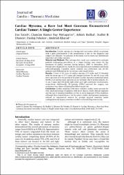 Introduction: Cardiac myxoma is a benign and rare tumor, which can present with a grim phenomenon if the presentation is late or the diagnosis and surgery are delayed. The purpose of this study was to share our institutional experience of cardiac myxoma. Material and Methods: This retrospective study was conducted to evaluate patients undergoing procedures at a single tertiary care centre for the treatment of cardiac myxoma during January, 2007 to December, 2017. Preoperative diagnosis was made by assessing clinical presentation and doing echocardiography. Complete tumor excision was performed, and all the patients were followed up for recurrence and complications. Results: A total of 45 cases of cardiac myxoma (13 males and 32 females) with the mean age of 37.5 years old (ranged between 16 and 60 years old) were operated over the period of 10 years. Cardiac myxoma constituted about 0.69% of all cardiac cases operated at our institute. Out of all the subjects, 41, 3, and 1 cases had left atrial, right atrial, and right ventricular involvements, respectively. Additionally, 43 patients (95%) survived the surgery, one recurrence was observed during the follow-up period. Conclusion: Cardiac myxoma is the most common cardiac tumor account for very small percentage of patients with heart disease. Early clinical suspicion and the use of imaging modalities are key to early diagnosis of this condition. Although these tumors have a risk for severe cardiac and systemic symptoms, referral to experienced centers for prompt surgical resection under cardiopulmonary bypass provides excellent early and long-term results.