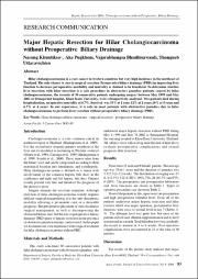 Hilar cholangiocarcinoma is a rare cancer in western countries but very high incidence in the northeast ofThailand. The only chance to cure is surgical resection. Preoperative biliary drainage (PBD) for improving liverfunction to decrease perioperative morbidity and mortality is claimed to be beneficial. To determine whetherliver resection with hilar resection is a safe procedure in obstructive jaundice patients caused by hilarcholangiocarcinoma, the records of 30 consecutive patients undergoing surgery between May 1999 and May2002 at Srinagarind hospital, Khon Kaen University, were retrospectively analyzed. Two patients died duringhospitalization, an operative mortality of 6.7%. Survival was 33% at 1 year, 12% at 2 years,10% at 3 years and6.7% at 4 years. In our experience, it is safe in most patients with obstructive jaundice due to hilarcholangiocarcinoma to perform liver resection without preoperative biliary drainage (PBD).