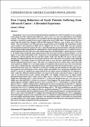 Background: Cancer is one of the major health problems thoughout the world. The number of cancer patientsis increasing, out of the estimated nine million new cancer cases every year, more than half are in developingcountries. The majority of these patients are incurable by the time their disease is diagnosed. Therefore, cancermortality is expected to continue to rise in those regions of the world (WHO, 2002). In Saudi Arabia, the latestreport from the Saudi Cancer Registry SCR for 2004 registered 9,381 new cases, of these cases 7,138 wereSaudis. The crude incidence rate CIR of all cancers among Saudis was 41.9/100,000. The total number of adultcancer incidence cases reported was 8595, and for children were 713 cases (NCR, 2004). The most commonfeared symptom encountered in advanced cancer is pain. Through their perpetual encounter with pain, advancedcancer patients usually maintain different coping behaviors. Internationally speaking, there are limited researchesand investigations that deal with cancer pain, and the importance of using adaptive coping behaviors to controlit. In Saudi Arabia, specifically, pain coping behaviors has never been assessed or discussed before, so is theimpact of cancer pain on the quality of life. The presence of any maladaptive coping behaviors with cancer painwill interfere with the patient's life style and their quality of life, and will affect the nurse's role in caring,planning, and implementing effective nursing interventions to reduce and control cancer patient's pain. Materialsand Methods: A descriptive design was used for this study to assess the pain coping behavior Among Saudipatients suffering from advanced cancer. The study was conducted at the two tumor centers which deal withcancer patients in Jeddah City. A convenient sample of 132 patients with advanced cancer who were returningto the clinics, radiation therapy and medical oncology departments of the aforementioned tumor centers wereincluded in the study. Data were collected by an interview schedule specially designed for this study, and thetime ranged between 20-40 minutes. Tool's content validity and reliability were checked and established at 89%and 85%, respectively. Administrative approval from the two tumor centers in Jeddah City was obtained forstudy conduction. Different statistical methods were used for data analysis and interpretation to specify thevalue of correlation between study variables using SPSS v 10. Results: Patients age were almost equallydistributed among thirties (22%), forties (24.2%), fifties (20.5%), and sixties (22.7%). Females (59.1%) wereslightly more than males (40.9%). About one half (47%) of them were diagnosed since one - two years age, andslightly more than half (56.8%) of them were unaware of their diagnosis. The major adaptive and Active paincoping behaviors included: religious practices such as: praying (99.2%); and listening or reciting the HolyQura'an (98.5%). Cognitive methods such as: thinking that one is more stronger than the pain (99.2%); thinkingthat one is still in a satisfactory health despite the pain (98.5%); distracting oneself from pain (93.9%); visualizationof pleasant scenes (92.4%); thinking about pleasant things (90.9%). The major maladaptive and passive paincoping behaviors included: decreasing activities by: specified positioning (97.7%); protecting the painful area(90.9%); and remaining still and avoiding movement (78%). Expression of feelings by: seeking help from others(90.2%); and crying or moaning (80.3%). Suppression of feelings and tolerating pain as it is (97%). Conclusions:Most of the adaptive and active pain coping behaviors were coming from patient's belief in god & their faith andtrust and holding and obeying Islamic commands. The informational support by the health care professionalswas unprovidable in the study sample, which brings the attention to the importance of nursing interventions inthis area by providing coordinated and directed programs.