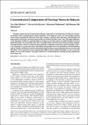 This paper reports on part of a large study to identify competencies of oncology nurses in Malaysia. It focuseson oncology nurses’ communications-related competency. As an important cancer care team member, oncologynurses need to communicate effectively with cancer patients. Literature shows that poor communication canmake patients feel anxious, uncertain and generally not satisfied with their nurses’ care. This paper deliberateson the importance of effective communication by oncology nurses in the context of a public hospital. Four focusgroup discussions were used in this study with 17 oncology/cancer care nurses from Malaysian public hospitals.The main inclusion criterion was that the nurses had to have undergone a post-basic course in oncology, or havework experience as a cancer care nurse. The findings indicated that nurses do communicate with their patients,patients’ families and doctors to provide information about the disease, cancer treatment, disease recurrence andside effects. Nurses should have good communication skills in order to build relationships as well as to providequality services to their patients. The paper concludes by recommending how oncology nursing competenciescan be improved.