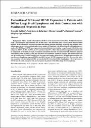 Background: Diffuse large B-cell lymphoma (DLBCL) is the most common form of non-Hodgkins lymphoma(NHL), accounting for approximately 25% of NHL cases. The aim of this study was to evaluate the associationbetween the BCL6 and MUM1 gene expression and patient prognosis and stage. Materials and Methods: Afterethical approval, in a cross-sectional study, tissue samples of 80 patients with diffuse large B-cell lymphoma wereanalyzed for BCL6 and MUM1 gene expression. Immunohistochemical staining was performed with division intocategories of 0-5%, 5-25%, 26-50%, 51-75% and more than 75%. Other clinical and histological information suchas lymph node involvement, T-stage, B symptoms and patient outcome were also recorded. Data were analyzedwith SPSS version 16 and a P-value less than 0.05 was considered significant. Results: The patient mean agewas 46.9±10.5 years (47.6±10.7 and 46.1±9.6 for males and females, respectively). A significant association wasseen between lymphoma stage and BCL6 (p=0.045) but not MUM1 expression (p=0.09). However, the latterwas associated with mortality (p=0.006) as was also the BCL6 level (p=0.006). Conclusions: : Overexpression ofMUM1 and BCL6 is associated with poor prognosis in patients with diffuse large B-cell lymphoma.