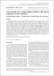 Background: In recent years, a somatic point mutation in the Janus Kinase 2 (JAK2) gene (1849 G→T, V617F)has been reported to occur in over 90% of patients with polycythemia vera (PV). Another JAK2 mutation in exon 12had been described and shown capable of activating erythropoietin signaling pathways. Objective: In this study, weaimed to determine the frequency of Jak2 mutations (JAK2V617F and JAK2 exon 12) as well as their relationshipswith hematological parameters in Sudanese patients with myeloproliferative disorders (MPD). A comparison withfindings of published studies from other geographic regions was included. Materials and Methods: From each ofa total of 83 polycythaemia patients, six milliliters (ml) of venous blood were collected and processed for molecularanalysis and measurement of serum erythropoietin level by enzyme-linked immunoassay (ELISA). The JAK2 V617Fmutation was determined using an allele-specific competitive blocker (ACB) -PCR assay and High Resolution Melting(HRM) analysis was applied for the JAK2 exon 12 mutation. Results: According to patients' history and the resultsfor EPO levels, nine (10.7 %) out of 83 patients were found to have secondary polycythaemia and 74 (89.3%) PV. Theoverall frequency of the 2 JAK2 mutations was 94.6% in our Sudanese PV patients, JAK2V617F being found in 91%and JAK2 exon 12 mutations in 8.1%.Conclusion: In summary JAK2 V617F and JAK2 exon 12 mutations are verycommon in Sudanese PC cases.