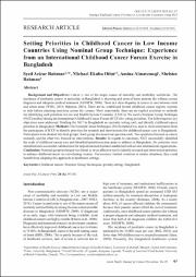Background and Objectives: Cancer is one of the major causes of mortality and morbidity worldwide. Theincidence of paediatric cancer in particular, in Bangladesh is alarming and most of these patients die without correctdiagnosis and adequate medical treatment (MOHFW, 2008). There is a clear disparity in access to care between ruraland urban areas (WHO, 2015; Rahman, 2001). There are no established formal childhood cancer registry systemsto help inform planning decisions across the country. Most importantly, there are no explicit priorities or methodsfor identifying such priorities in Low and Middle Income Countries (LMICs). We used a Nominal Group Technique(NGT) method during the International Childhood Cancer Forum (ICCF) for setting priorities. The following two keyobjectives were addressed: Trialling the NGT in Bangladesh as a priority setting tool; and identify childhood cancerpriorities in Bangladesh. Methods: The Nominal Group Techniques (NGT) method was used to elicit information fromthe participants of ICCF to identify priorities for research and interventions for childhood cancer care in Bangladesh.Participants were divided into four groups. Each group discussed one question each. Two questions focused on cancerresearch, and the other two focused on interventions. Results: In regards to outcomes, NGT successfully identifiedthe scale of childhood cancer care and identified priorities/action areas to address in Bangladesh. Six priorities wereidentified and a successful collaboration for implementation has been established with several international organisations.Conclusion: Nominal group technique was found to be an effective tool to identify research and intervention prioritiesto address childhood cancer in a developing country. For resource limited countries in similar situations, they couldbenefit from adopting this approach in healthcare settings.