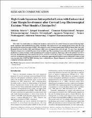 This study was undertaken to evaluate the incidence and severity of residual lesions in women featuring highgradesquamous intraepithelial lesion (HSIL) histology with endocervical cone margin involvement after the loopelectrosurgical excision procedure (LEEP). The medical records of women undergoing LEEP at Chiang Mai UniversityHospital between October 2004 and February 2006 were retrospectively reviewed and 74 cases were identified.Nineteen women were excluded because of loss to follow-up. The remaining 4 were referred to other hospitals and 2declined re-excision, leaving a study population of 55 women for analysis. Mean age ± SD of the patients was 48.5 ±8.9 years. Residual lesions were noted in 26 (47.3%, 95%CI= 33.7 to 61.2). Four (7.3%) had unrecognized invasivecervical carcinoma in subsequent specimens. In conclusion, approximately half of women with positive endocervicalcone margins after LEEP for HSIL histology have residual disease. Repeat diagnostic excision is recommended forevaluation of lesions and severity.