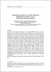 سنگهای منطقة رباعی، در کمربند ترود- چاهشیرین در جنوب دامغان، شامل واحدهای آتشفشانی ائوسن با ترکیب آندزیت و تراکیآندزیت هستند. سنگهای آذرین نیمهژرف بهصورت استوک و دایک با ترکیب دیوریت، مونزونیت و مونزودیوریت پورفیری در این واحدها نفوذ کردهاند. بافت اصلی سنگهای آتشفشانی پورفیریتیک است و درشتبلورهایی از کانیهای پلاژیوکلاز، هورنبلند و بیوتیت دارند. آپاتیت و زیرکن کانی فرعیِ این واحدها هستند. این سنگها بیشتر سرشت شوشونیتی و یک نمونة نیز سرشت کالکآلکالن پتاسیم بالا دارند. غنیشدگی از LILE و LREE، بههمراه تهیشدگی از HREE و HFSE و ناهنجاری منفی عنصرهای Nb و Ti همراه با شواهد دیگر، مانند نسبت بالای Th/Yb در این سنگهای آتشفشانی، نشاندهندة پیدایش آنها در یک محیط مرتبط با فرورانش در مرز فعال قارهای هستند. مقدار 87Sr/86Sr، 143Nd/144Nd اولیه و εNd)i) آندزیت بهترتیب برابربا 704445/0، 512691/0 و 29/2 است. همة این ویژگیها پیدایش سنگهای آتشفشانی منطقة رباعی را از ذوببخشی گوة گوشتهای در بالای پهنة فرورانش تأیید میکنند. یافتههای سنگشناسی همراه با دادههای زمینشیمیایی عنصرهای کمیاب و خاکی کمیاب نشاندهندة گرایش کالکآلکالن، آلایش و هضم مواد پوستهای، جدایش بلورین و پیدایش ماگما سازندة آنها در پهنههای فرورانشی است.