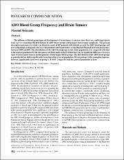 The influence of blood group types on development of brain tumors is unclear since there are conflicting reportsfrom surveys regarding the distribution of ABO blood groups and primary intracranial neoplasms. The presentdescriptive, retrospective study was therefore made of 907 patients with reliable records for ABO blood groups andproven histological diagnosis who were hospitalized with brain tumors at the Shariati Hospital neurosurgical center,between 1980 and2002. The distribution of the ABO blood groups in this study population was compared with thatin the general population by the chi-square test. Data analysis showed that there are no significant differences betweentypes of intracranial tumors and frequencies of four major blood groups. The distribution of the ABO blood groupsin patients did not differ significantly from that of the general population. Of our patients with craniopharyngioma,however, significantly more were in group A (P