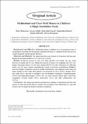 Background and Objective: Mediastinal masses in children are a heterogenous group of asymptomatic potentially life-threatening congenital, infectious, or neoplastic lesions that present complex diagnostic and therapeutic dilemmas. Materials and Methods: The clinical and laboratory features of 65 patients who had open biopsies in Ali-Asghar hospital over 11 years were reviewed. Results: Seventy-two percent of cases were male and 28% were female. The age varied between 2.5 months and 19 years. Eighty-four percent of lesions were malignant and 16% were benign. Neurogenic tumors were the most common (36.9%). In order of frequency the following lesions were the most common neuroblastoma (mostly in posterior mediastinum), Hodgkin's and non-Hodgkin's lymphoma (mostly in middle mediastinum), and malignant small round cell tumor (mostly in chest wall). Most patients were presented by fever (21.5%), dyspnea (20%) and cough (12%), especially in Hodgkin's and non-Hodgkin's lymphoma. Lymphadenopathy (29.2%) and hepatosplenomegaly (13.8%) were the most frequent clinical signs. Laboratory examination revealed anemia (29%), leukocytosis (35%), and high sedimentation rate (21.5%). Conclusion: The clinical presentation and laboratory findings of mediastinal and chest wall masses are often non-specific and are variable, but according to their clinical data (i.e. age) and location, only few important diagnoses should be considered.