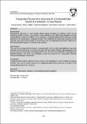 Introduction: Pleomorphic adenoma is a rare benign salivary gland neoplasm in children, which can be treated by simple excision. This tumor is rarely included in the differential diagnosis of solid submandibular masses in children. In the neonates, congenital pleomorphic adenoma usually presents in the nasopharynx. Surgical excision is the treatment of choice and recurrence is not expected. We report what appears to be the first case of congenital pleomorphic adenoma in the submandibular region in a one-day-old newborn. Case Report: The case of a one-day-old term baby is presented with a 5x2 cm left submandibualr mass with extension to the oral cavity. The mass was hard and non-mobile. During Ultrasonography and Contrast-enhanced Computed Tomography (CT) scan, the mass was solid with a heterogeneous internal structure. The tumor was completely excised and proved to be a pleomorphic adenoma during histopathological examination. Conclusion: Congenital pleomorphic adenoma rarely occurs in the nasopharynx and is treated by surgical excision. Our case is unique because the congenital pleomorphic adenoma is located in the submandibular gland of a newborn.