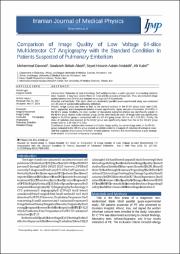 Introduction: Reduction of peak kilovoltage (kV) setting has been a useful approach to d creating radiation dose; however, it may have varied effects on noise and the accuracy of diagnosis. Thus, we compared image quality between low (80 kV) and standard kilovoltage (100 kV) protocols. Material and Methods: This triple blind non-randomized parallel quasi-experimental study was conducted on 140 cases of questionable pulmonary embolism. Results: Image quality was twice as high as the standard protocol in the 80-kV group (odds ratio=2.08). Main, segmental, and subsegmental arteries showed significantly higher vascular enhancement (P Conclusion: Lower radiation dose received and higher image quality, but worse image noise, in the 80-kV group compared to the 100-kV group present acceptable evidence in support of reduction of voltage in cases with the suspicion of pulmonary embolism. In these patients, therefore, it is recommended as a good strategy to be adopted in computed tomography angiography.