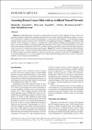 Objectives: Radiologists face uncertainty in making decisions based on their judgment of breast cancer risk.Artificial intelligence and machine learning techniques have been widely applied in detection/recognition of cancer.This study aimed to establish a model to aid radiologists in breast cancer risk estimation. This incorporated imagingmethods and fine needle aspiration biopsy (FNAB) for cyto-pathological diagnosis. Methods: An artificial neuralnetwork (ANN) technique was used on a retrospectively collected dataset including mammographic results, riskfactors, and clinical findings to accurately predict the probability of breast cancer in individual patients. Area underthe receiver-operating characteristic curve (AUC), accuracy, sensitivity, specificity, and positive and negative predictivevalues were used to evaluate discriminative performance. Result: The network incorporating the selected featuresperformed best (AUC = 0.955). Sensitivity and specificity of the ANN were respectively calculated as 0.82 and 0.90.In addition, negative and positive predictive values were respectively computed as 0.90 and 0.80. Conclusion: ANNhas potential applications as a decision-support tool to help underperforming practitioners to improve the positivepredictive value of biopsy recommendations.