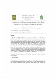 The objective of the article is to investigate the variability in growth and wood properties of the willow clones. The growth and wood traits of four year old 21 clones willow clones were investigated. Analysis of variance showed that willow clones differed significantly for all the studied growth and wood traits. Among the growth parameters the maximum heritability value was shown by height which was 0.92 (92%) and minimum of 0.59 (59%) was recorded for wood and bark percentage. The mean value of specific gravity is 0.76 (Heritability 0.69) and mean value of fiber length is 1.41 mm and value of heritability factor is 0.77. The value of heritability factor is high for alcohol-benzene extractive content (heritability value= 0.73). Wide range of variability was seen for all the physico-chemical characteristics of wood of promising willow clones. The values for phenotypic and genotypic coefficients of variability, heritability, genetic advance and genetic gain ranged between 2.51-35.63, 2.09-30.49, 24-92, 0.03-31.20 and 3.95-53.73%, respectively.