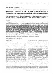 Background: Cervical cancer (CeCa) is the second most common cancer in women in developing countries,and human papilloma virus (HPV) is the primary etiological factor. Aberrant expression of HOX transcriptionfactors has been observed in several types of cancer. To date, however, no reports exist on the expression ofHOXB2 and HOXB13 proteins during neoplastic progression in CeCa and its correlation with HPV infection.Materials and Methods: Expression of HOXB2 and HOXB13 proteins was assessed in tissue microarrays fromnormal cervical epithelium, cervical intraepithelial neoplasias grade 1-3, and CeCa. HPV was detected by PCRand sequencing. Expression of HOX-positive cells was determined in each diagnostic group. Results: Percentageof HOXB2- and HOXB13-positive cells gradually increased from means of 10.9% and 16.7%, respectively, insamples from healthy women, to 75.2% and 88.6% in those from CeCa patients. Frequency of HPV infectionalso increased from 13% in healthy tissue samples to 92.3% in CeCa. Both HOXB2 and HOXB13 proteinswere preferentially expressed in HPV+ samples. Conclusions: The present study represents the first report onthe expression of both HOXB2 and HOXB13 proteins through cervix tumorigenesis, providing evidence thatincreased expression of such proteins is a common event during progression to CeCa.