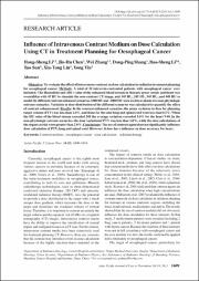 Objective: To evaluate the effect of intravenous contrast on dose calculation in radiation treatment planningfor oesophageal cancer. Methods: A total of 22 intravein-contrasted patients with oesophageal cancer wereincluded. The Hounsfield unit (HU) value of the enhanced blood stream in thoracic great vessels and heart wasoverridden with 45 HU to simulate the non-contrast CT image, and 145 HU, 245 HU, 345 HU, and 445 HU tomodel the different contrast-enhanced scenarios. 1000 HU and -1000 HU were used to evaluate two non-physiologicextreme scenarios. Variation in dose distribution of the different scenarios was calculated to quantify the effectof contrast enhancement. Results: In the contrast-enhanced scenarios, the mean variation in dose for planningtarget volume (PTV) was less than 1.0%, and those for the total lung and spinal cord were less than 0.5%. Whenthe HU value of the blood stream exceeded 245 the average variation exceeded 1.0% for the heart V40. In thenon-physiologic extreme scenarios, the dose variationof PTV was less than 1.0%, while the dose calculations ofthe organs at risk were greater than 2.0%. Conclusions: The use of contrast agent does not significantly influencedose calculation of PTV, lung and spinal cord. However, it does have influence on dose accuracy for heart.