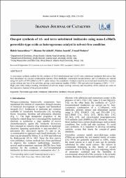 A convenient synthetic method for the synthesis of 2,4,5-trisubstituted and 1,2,4,5-tetra substituted imidazole derivatives, has been developed via one-pot condensation reaction in solvent-free condition when aldehyde, ammonium acetate/amine, and 1,2-diketone are reacted using 0.8 mol% of NP-LaMnO3 at 80 °C under solvent free conditions. Catalyst could be recovered and reused in five reaction cycles without any loss of its activities, giving a total turnover number (TON) = 594 and turn over frequency (TOF) = 71 h−1. High yield, little catalyst loading, elimination of solvent, simple workup, recovery and reusability of the catalyst are some of the impressive features of the present method.