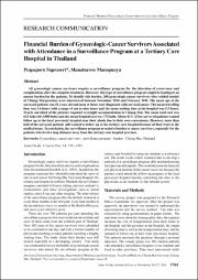 All gynecologic cancer survivors require a surveillance program for the detection of recurrence andcomplications after the complete treatment. However, this type of surveillance program might be leading to anunseen burden for the patients. To identify this burden, 200 gynecologic cancer survivors who resided outsideof Chiang Mai province were interviewed between November 2010 and February 2011. The mean age of thesurveyed patients was 52 years old and most of them were diagnosed with cervical cancer. The mean travellingtime was 3.6 hours with a range of one to nine hours and the mean waiting time at the hospital was 5.3 hours.Nearly one-third of the patients required overnight accommodation in Chiang Mai. The mean total cost was643 baht (60-3,000 baht) and the mean hospital cost was 172 baht. About 44% of the surveyed patients wantedfollow up at the local provincial hospital near their abode due to their own convenience. However, more thanhalf of the surveyed patients still wanted to follow up at the tertiary care hospital because of their trust in themedical team. In conclusion, the surveillance program revealed a burden to cancer survivors, especially for thepatients who lived a long distance away from the tertiary care hospital province.