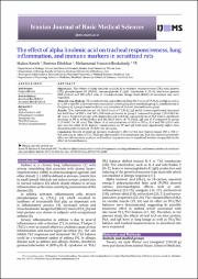 Objective(s): The effects of alpha linolenic acid (ALA) on tracheal responsiveness (TR), total protein (TP), phospholipase A2 (PLA2), immunoglobulin E (IgE), interleukin 4 (IL-4), interferon gamma (INF-γ) level and INF-γ/IL4 ratio in bronchoalveolar lavage fluid (BALF) of sensitized rats were examined.Materials and Methods: TR to methacholine and ovalbumin (OA), BALF levels of TP, PLA2 and IgE as well as IL-4, INF-γ and INF-γ/IL4 ratio were measured in control group (non-sensitized, group C), sensitized rats to OA (group S), S groups treated with two concentrations of ALA and dexamethasone group. Results: TR to methacholine and OA, BALF levels of TP, PLA2, IgE and IL-4 were significantly increased but BALF level of INF-γ and INF-γ/IL4 ratio decreased in group S compared to group C (PConclusion: Results showed an immune modulatory effect of the ALA that increased INF-γ, INF-γ/IL4 ratio (as an index of Th1/Th2) and decreased IL-4 in sensitized rats. ALA also showed preventive effect on inflammatory markers and tracheal responsiveness in sensitized animals comparable to the effect of dexamethasone.