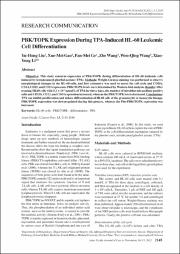 Objective: This study concerns expression of PBK/TOPK during differentiation of HL-60 leukemic cellsinduced by tetradecanoyl phorbol acetate (TPA). Methods: Wright-Giemsa staining was performed to observemorphological changes in the HL-60 cells, and flow cytometry was used to assess the cell cycle and CD11b,CD14, CD13, and CD33 expression. PBK/TOPK levels were determined by Western blot analysis. Results: Aftertreating HL60 cells with 5.1 × 10-9 mmol/L of TPA for three days, the number of nitroblue-tetrazolium-positivecells and CD11b, CD13, and CD14 expression increased, whereas the PBK/TOPK levels decreased. Conclusions:TPA can inhibit proliferation and induce differentiation of HL60 cells of the granulocytic or monocytic lineage.PBK/TOPK expression was downregulated during this process, whereas the Pho-PBK/TOPK expression wasincreased.