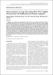 Objective: To investigate the expression level of TUG1 and one of its transcript variants (n377360) inosteosarcoma cells and assess the role of TUG1 in proliferation and apoptosis in the U2OS cell line. Methods:TUG1 and n377360 expression levels in patients with osteosarcomas and the U2OS human osteosarcoma cellline were evaluated using real-time quantitative PCR. U2OS cells were transected with TUG1 and n377360siRNA or non-targeting siRNA. MTS was performed to assess the cell proliferation and flow cytometry wasapplied to analyze apoptosis. Results: We found significantly higher TUG1 and n377360 expression levels inosteosarcoma tissues compared with matched non-tumorous tissues. In line with this, suppression of TUG1and n377360 expression by siRNA significantly impaired the cell proliferation potential of osteosarcoma cells.Furthermore, inhibition of TUG1 expression significantly promoted osteosarcoma cell apoptosis. Conclusions:The overexpression of TUG1 and n377360 in osteosarcoma specimens and the functional role of TUG1 andn377360 regarding cell proliferation and apoptosis in an osteosarcoma cell line provided evidence that the useof TUG1 or n377360 may be a viable but an as yet unexplored therapeutic strategy in tumors that over expressthese factors.