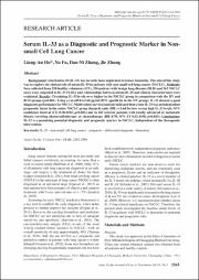 Background: Interleukin-33 (IL-33) has recently been implicated in tumor immunity. The aim of this studywas to explore the clinical role of serum IL-33 in patients with non-small-cell lung cancer (NSCLC). Methods:Sera collected from 250 healthy volunteers (HV), 256 patients with benign lung diseases (BLD) and 262 NSCLCcases were subjected to IL-33 ELISA and relationships between serum IL-33 and clinical characteristics wereevaluated. Results: Circulating IL-33 levels were higher in the NSCLC group in comparison with the HV andBLD groups (pConclusions:IL-33 is a promising potential diagnostic and prognostic marker in NSCLC, independent of the therapeuticintervention.
