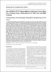 Methylenetetrahydrofolate reductase (MTHFR) is an essential enzyme involved in folate metabolism; a singlenucleotide polymorphism (SNP) C677T has been reported to be linked with altered incidences of several diseases.We here conducted a meta-analysis of 15 published epidemiological studies with a total of 7306 cases and 8062controls to evaluate its association with prostate cancer risk with overall and subgroup analyses. No statisticalrelationship was found overall with any genetic model (TT vs. CC: OR = 0.80, 95%CI = [0.62, 1.04], P = 0.094;CT vs. CC: OR = 0.97, 95%CI = [0.84; 1.12], P = 0.667; Dominant: OR = 0.94, 95%CI = [0.82; 1.07], P = 0.343;Recessive: OR = 0.81, 95%CI = [0.64; 1.04], P = 0.104), but after the exclusion of several studies, we could observethe homozygote TT to confer less susceptibility to prostate cancer in carriers; moreover, different effects of thepolymorphism on prostate cancer risk was detected from subgroup analysis stratified by participants’ residentialregion: significant reduced prostate cancer risk was found to be associated with the polymorphism from Asianstudies (TT vs. CC: OR = 0.47, 95%CI = [0.33; 0.67], P