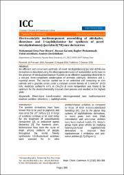 An efficient and convenient synthesis of novel tetrahydrobenzo[c]acridin-8(7H)-one derivatives is described using the electrogenerated anion of acetonitriles as the base in the presence of tetrabutylammonium fluoride as an effective supporting electrolyte in a one-pot, three-component condensation of aromatic aldehyde, dimedone and 1-naphthyl amine. The reaction is carried out in an undivided cell containing an iron cathode and a graphite anode under a constant current density of 5 mA/cm2 (I=20 mA, electrode surface=5 cm2) in CH3CN at room temperature was found to be optimum for the electrochemically induced chain process and resulted in the highest yield. An efficient and convenient synthesis of novel tetrahydrobenzo[c]acridin-8(7H)-one derivatives is described using the electrogenerated anion of acetonitriles as the base in the presence of tetrabutylammonium fluoride as an effective supporting electrolyte in a one-pot, three-component condensation of aromatic aldehyde, dimedone and 1-naphthyl amine. The reaction is carried out in an undivided cell containing an iron cathode and a graphite anode under a constant current density of 5 mA/cm2 (I=20 mA, electrode surface=5 cm2) in CH3CN at room temperature was found to be optimum for the electrochemically induced chain process and resulted in the highest yield.