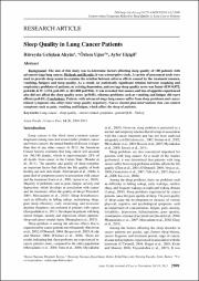Background: The aim of this study was to determine factors affecting sleep quality of 100 patients withadvanced stage lung cancer. Methods and Results: it was a descriptive study. A variety of assessment tools wereused to provide sleep scores to examine the relation between adverse effects caused by the treatment (nausea,vomiting, fatigue) and sleep quality. As a result, no statistically significant relation between coughing andrespiratory problems of patients, or existing depression, and average sleep quality score was found (KW:0.872,p=0.646, KW: 3.174, p=0.205, u: 441.000 p=0.916). It was revealed that nausea and loss of appetite experiencedalso did not affect the sleep quality score (p>0.05), whereas problems such as vomiting and fatigue did exerteffects (p0.05), whereas problems such as vomiting and fatigue did exerteffects (pConclusions: Patients with advanced stage lung cancer suffer from sleep problems and cancerrelated symptoms also affect their sleep quality negatively. Nurses should plan interventions that can controlsymptoms such as pain, vomiting and fatigue, which affect the sleep of patients.