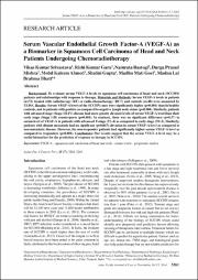 Background: To evaluate serum VEGF-A levels in squamous cell carcinoma of head and neck (SCCHN)patients and relationships with response to therapy. Materials and Methods: Serum VEGF-A levels in patients(n=72) treated with radiotherapy (RT) or radio-chemotherapy (RCT) and controls (n=40) were measured byELISA. Results: Serum VEGF-A levels of the SCCHN cases were significantly higher (p=0.001) than in healthycontrols, and in patients with positive as compared to negative lymph node status (p=0.004). Similarly, patientswith advanced stage (Stage III-IV) disease had more greatly elevated levels of serum VEGF-A level than theirearly stage (Stage I-II) counterparts (p=0.001). In contrast, there was no significant difference (p=0.57) inserum level of VEGF-A in patients with advanced T-stage (T3-4) as compared to early stage (T1-2). Similarly,patients with distant metastasis had no significant (p=0.067) elevation in serum VEGF-A level as compared tonon-metastatic disease. However, the non-responder patients had significantly higher serum VEGF-A level ascompared to responders (p=0.001). Conclusions: Our results suggest that the serum VEGF-A level may be auseful biomarker for the prediction of response to therapy in SCCHN.