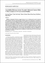 Objective: Experimental studies have suggested green tea to be a chemopreventive agent for colorectalcancer, and many studies have examined possible associations. However, the conclusions were inconsistent oreven contradictory, so we performed a meta-analysis based on published case-control studies to explore if greentea is indeed a protective factor. Methods: PubMed was searched up to May 10th, 2012 for relevant studies, andreferences of included studies were manually searched. Finally 13 eligible studies, involving 12,636 cases and38,419 controls were identified. After data extraction, a meta-analysis was performed using CMA v2 software.Results: The results indicated there may be a weak but not statistically significant reduced risk of colorectalcancer with high dose of green tea intake (OR=0.95, 95% CI:0.81-1.11, p=0.490.69–0.98). This protective effectwas also found in all subgroups, except in American and European populations. Sensitivity analysis indicatedthe result to be robust. Publication bias was not detected by either funnel plot or Egger tests. Conclusion: Theresults of this meta-analysis indicate a weak lower tendency for colorectal cancer development with green teaconsumption, but available epidemiologic data are insufficient to conclude that green tea may protect againstcolorectal cancer in humans.