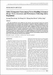This study identified the actual conditions for safe anticancer drug management among nurses and therelationship between level of awareness and performance of anticancer drug safety regulations in terms ofpreparation, administration, and disposal. The respondents were 236 nurses working with chemotherapy in wardsand outpatient clinics in five hospitals in and near Seoul. Safety regulations provided for the anticancer drugthe Occupational Safety Health Administration (OSHA, 1999), as modified for an earlier study, were used. Theresults showed that the level of awareness and performance on the anticancer drug safety regulations indicatetheir preparation (3.38±0.55, 2.38±0.98), administration (3.52±0.46, 3.17±0.70), general handling and disposal(3.33±0.54, 2.42±0.90) on a scale 0 to 5. Also, there were significant differences in job positions, work experience,type of preparation, and continuing education and a positive relationship between the level of awareness andnursing performance. Thus, nurses should receive continuing education on the handling of anticancer drugs toimprove the level of performance following safety regulations.
