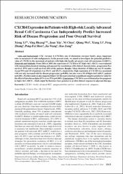 Aims and background: CXC receptor 4 (CXCR4), one of chemokine receptor family, plays important roles in metastasis of solid malignancies. In the present study, we aimed to investigate the potential predictive value of CXCR4 in the metastasis of patients with high-risk locally advanced renal cell carcinoma (LARCC). Materials and Methods: From 2001 to 2005, the expression of CXCR4 in 117 high-risk LARCCs was evaluated with immunohistochemical staining and assessed for correlations with clinical characteristics, progression-free survival (PFS) and overall survival (OS) of the patients. Results: Mean duration of follow-up was 51 months. 4-year PFS and OS of patients was 55.6% and 69.2%, respectively. High expression of CXCR4 was associated with not only increased risk for disease progression (p=0.001), but also worse OS of high-risk LARCC patients (p=0.001). Further analysis also suggested that CXCR4 expression had a significant negative predictive value for the effect of interferon alpha (IFN-α) on PFS (p=0.003). Conclusions: CXCR4 is a novel biomarker for prognosis in high-risk LARCC, which might furthermore have promise to predict clinical response to adjuvant therapy.