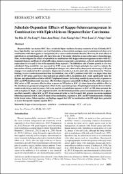 Hepatocellular carcinoma (HCC) has a relatively higher incidence in many countries of Asia. Globally, HCChas a high fatality rate and short survival. Epirubicin, a doxorubicin analogue, may be administered alone or incombination with other agents to treat primary liver cancer and metastatic diseases. However, the toxic effects ofepirubicin to normal tissues and cells have been one of the major obstacles to successful cancer chemotherapy.Here, we investigated the effects of epirubicin in combination with kappa-selenocarrageenan on mice with H22implanted tumors and HepG-2 cell proliferation, immune organ index, morphology, cell cycle and related proteinexpressions in vivo and in vitro with sequential drug exposure. The inhibitory rate of tumor growth in vivo wascalculated. Drug sensitivity was measured by MTT assay, and the King’s principle was used to evaluate theinteraction of drug combination. Morphological changes were observed by fluorescent microscopy. Cell cyclechanges were analyzed by flow cytometry. Expression of cyclin A, Cdc25A and Cdk2 were detected by Westernblotting. In vivo results demonstrated that the inhibitory rate of EPI combined with KSC was higher than thatof KSC or EPI alone, and the Q value indicated an additive effect. In addition, KSC could significantly raise thethymus and spleen indices of mice with H22 implanted tumors. In the drug sensitivity assay in vitro, exposure toKSC and EPI simultaneously was more effective than exposure sequentially in HepG-2 cells, while exposure toKSC prior to EPI was more effective than exposure to EPI prior to KSC. Q values showed an additive effect inthe simultaneous group and antagonistic effects in the sequential groups. Morphological analysis showed similarresults to the drug sensitivity assay. Cell cycle analysis revealed that exposure to KSC or EPI alone arrested thecells in S phase in HepG-2 cells, exposure to KSC and EPI simultaneously caused accumulation in the S phase,an effect caused by either KSC or EPI. Expression of cyclin A, Cdc25A and Cdk2 protein was down-regulatedfollowing exposure to KSC and EPI alone or in combination, exposure to KSC and EPI simultaneously resultingin the lowest values. Taken together, our findings suggest that KSC in combination with EPI might have potentialas a new therapeutic regimen against HCC.